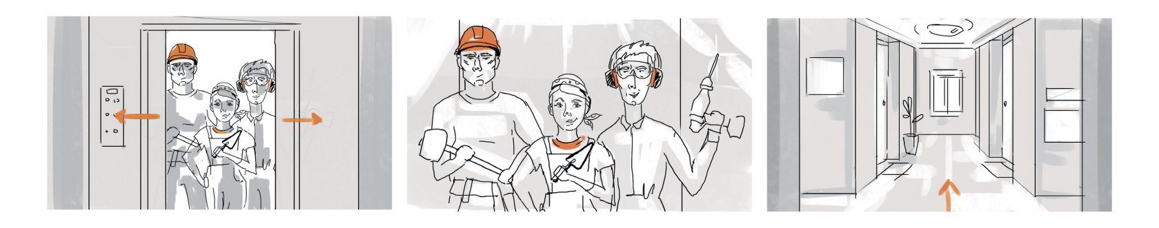 В кадре видим трех типичных строителей, олицетворяющих разрушительную силу ремонта: женщина в косынке с мастерком, мужчина с дрелью и мужчина в каске и с кувалдой (30-35 лет).
